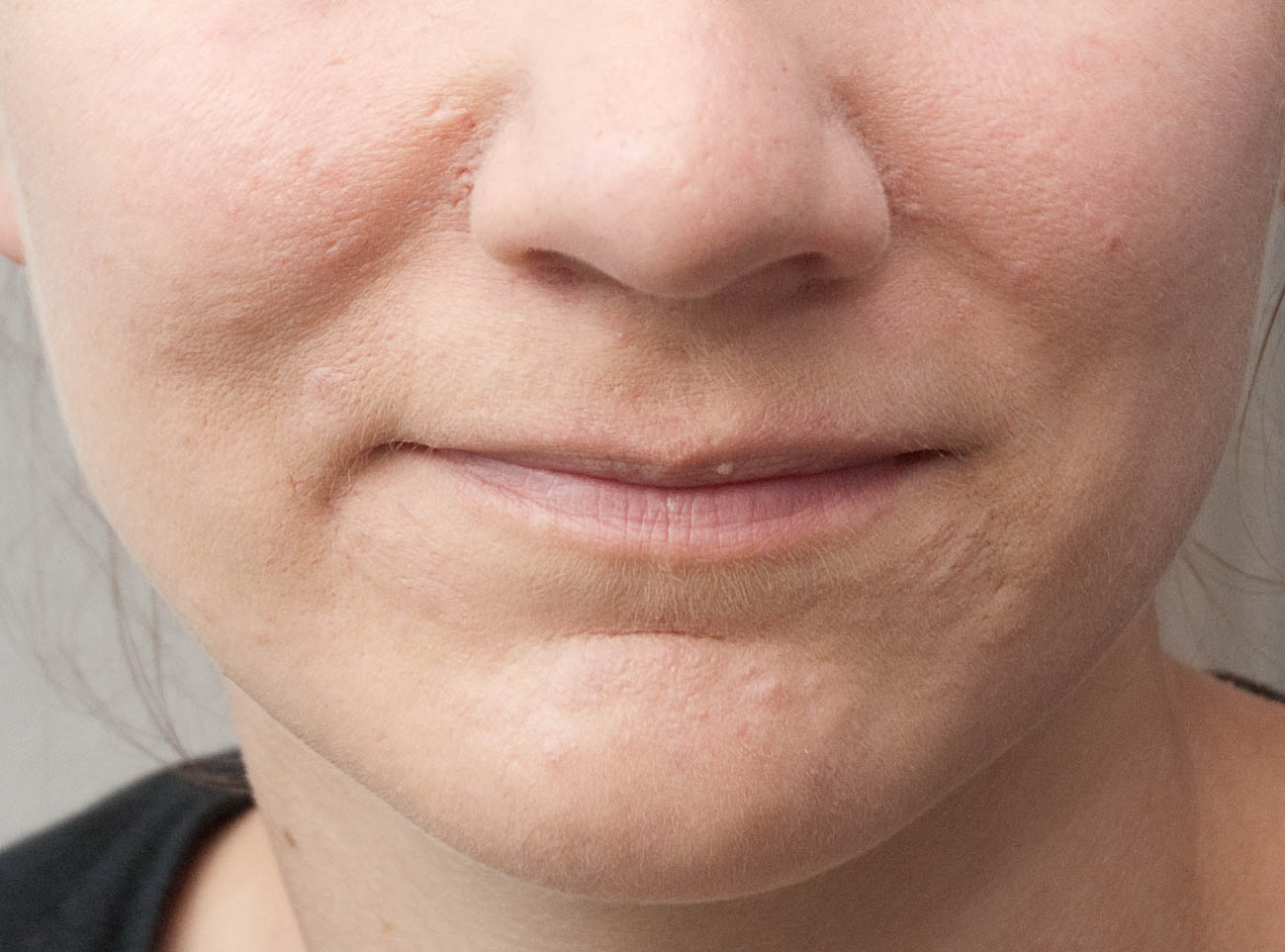 Minulla ei ole juuri arpia, mutta muutoin näytti lähes samalta. Omat konstit on säännöllinen kunnon kuorinta, kosteutus, raikastuskasvovesipyyhinnät- ja oikein muuta ei tarvita- se pikku epätasaisuus ei haittaa, kun iho on muutoin raikas.