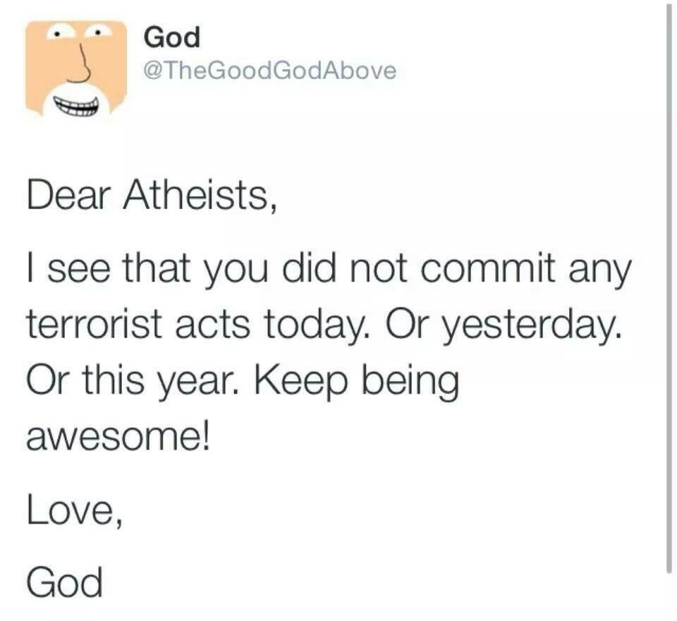 "Ja kun vielä suljetaan muidenkin ateistien tekemät terroriteot pois niin ei jää yhtään terroritekoa jäljelle."