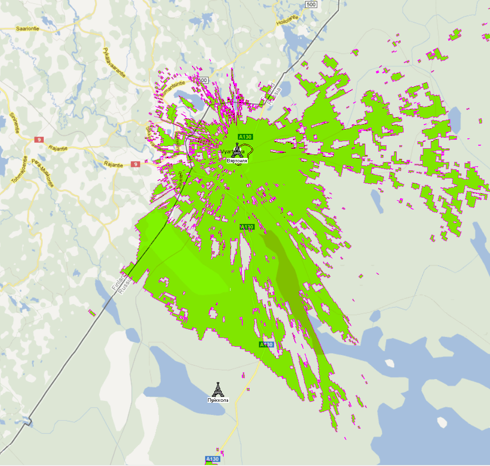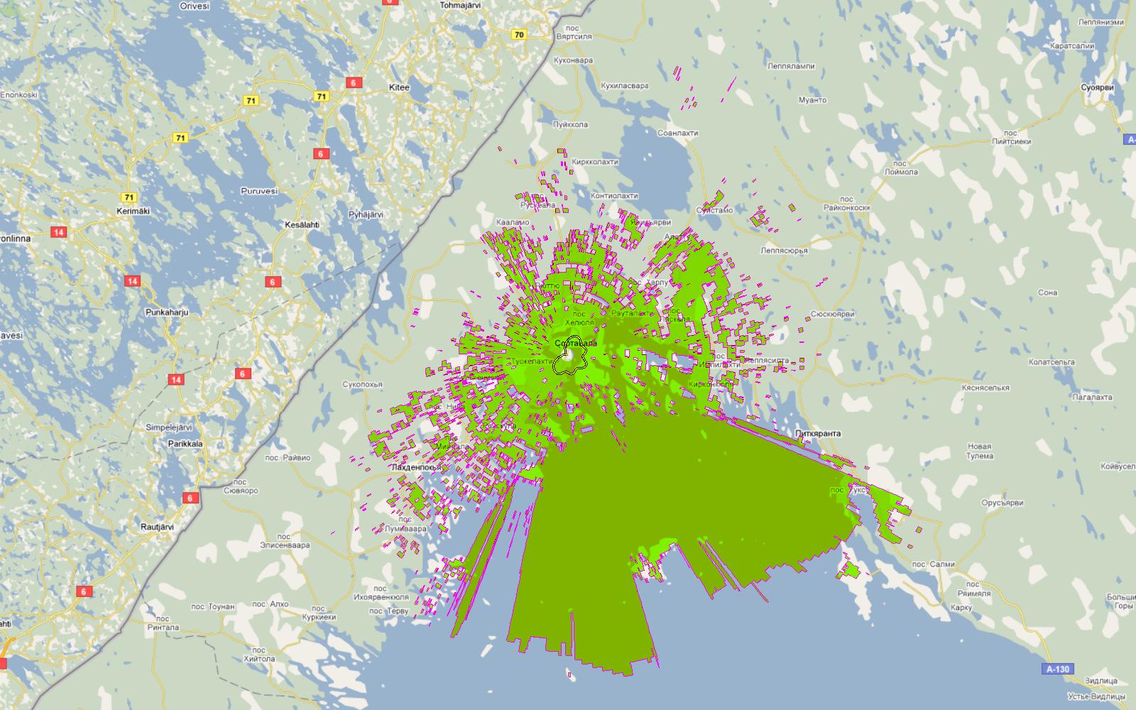 Tuossa alla on joidenkin Karjalan tasavallan alueella olevien lähetysasemien (ja nimenomaan digi-tv lähetysten) näkyvyysalueita: