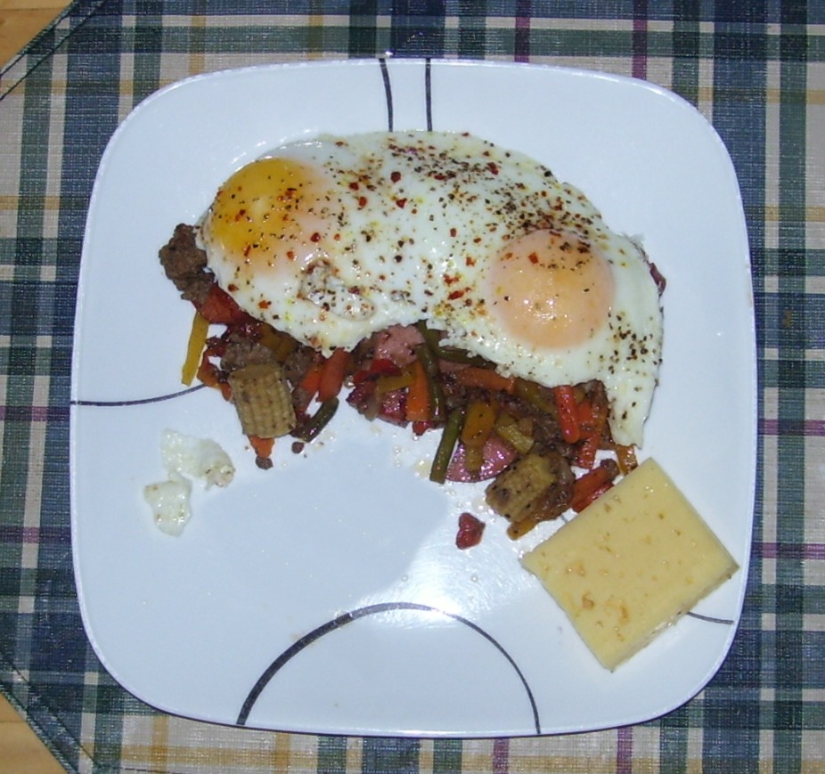 Minulla desi mifua, pikkuruinen sipuli, pari siivua juustoa ja 1 kanamuna hyvin maustettuna pannulla paistettuna, koko komeus VHH leivälle kurkkua ja pikku tomaatteja lisukkeena vihreää teetä kyytipokana! On hyvää!