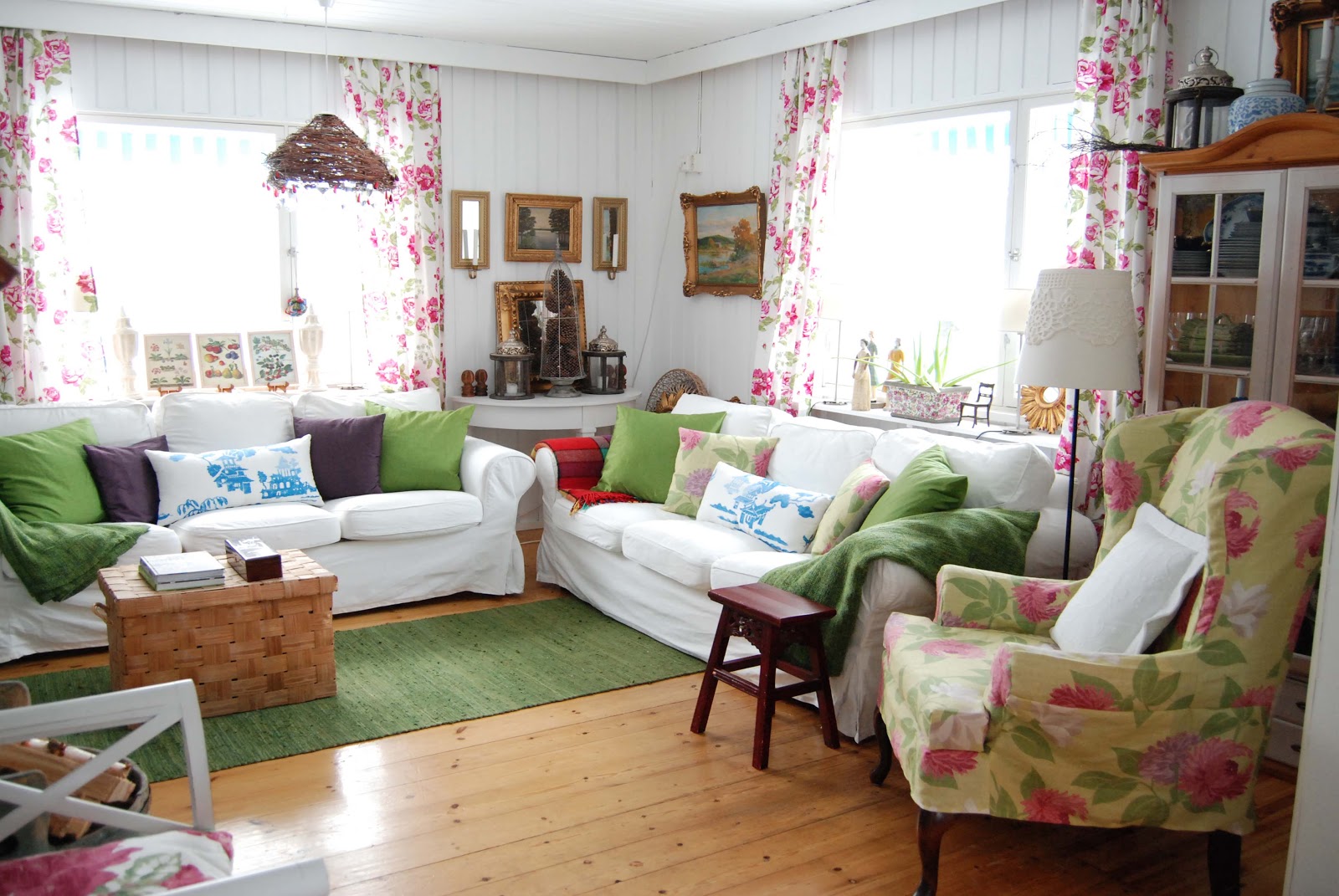 Mä en pidä noista kummastakaan. Ensimmäinen on ihan kauhea valkoisuudessaan, ja toinenkin on aneeminen, kaikki kuitenkin liian haaleata ja vaaleata, vaikka haettukin väriä. Vaikka onhan se kodikkaampi kuin edellinen. Katosta roikkuva varjostin ihan kamala risukko ja muutenkin vähän epäselvä kokonaisuus. Ehkä nuo kukalliset verhot mua mättää, mutta sehän on makuasia. Mutta ehdottomasti siinä oleskelisin mieluummin kuin tossa täydessä valkoisuudessa.