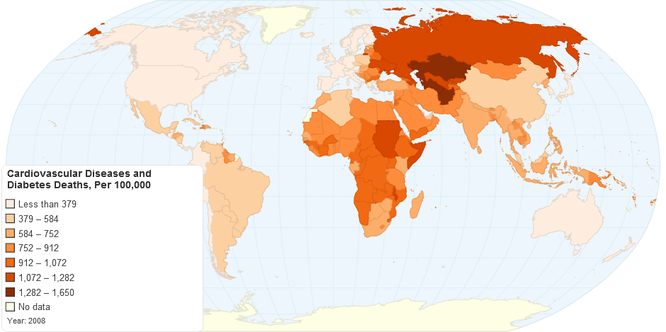 Kartasta näkyy hyvin, että sydän- ja verisuonitauteihin ja diabetekseen kuollaan eniten köyhimmissä maissa Afrikassa ja Aasiassa. Tilanne on muuttunut vuoden 2008 jälkeen vielä niin, että ongelma on kasvanut eniten Afrikassa.