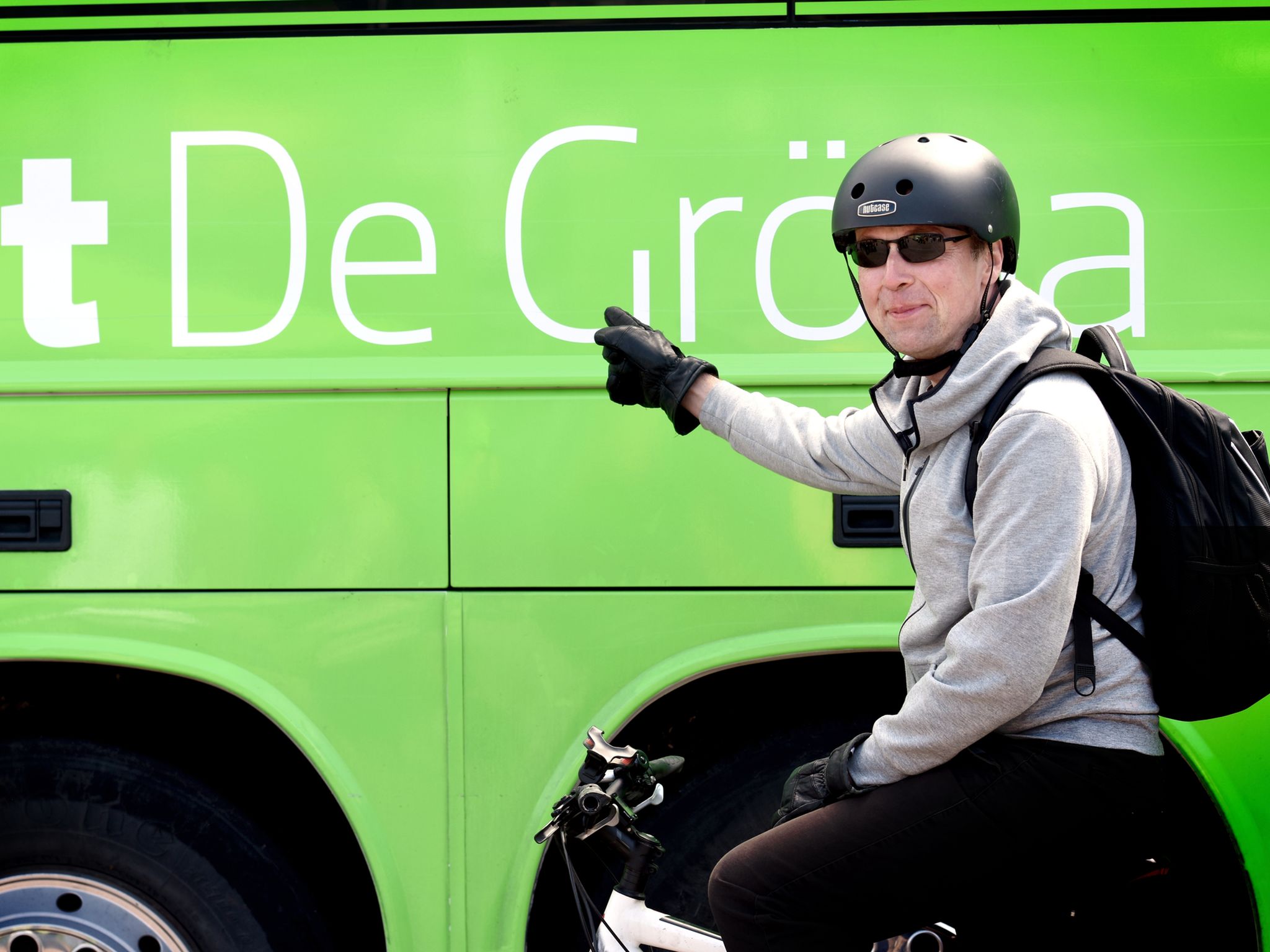 eli vihreän puolueen bussinviertä. Bussi käyttää ympäristöntuhnesttä diesel