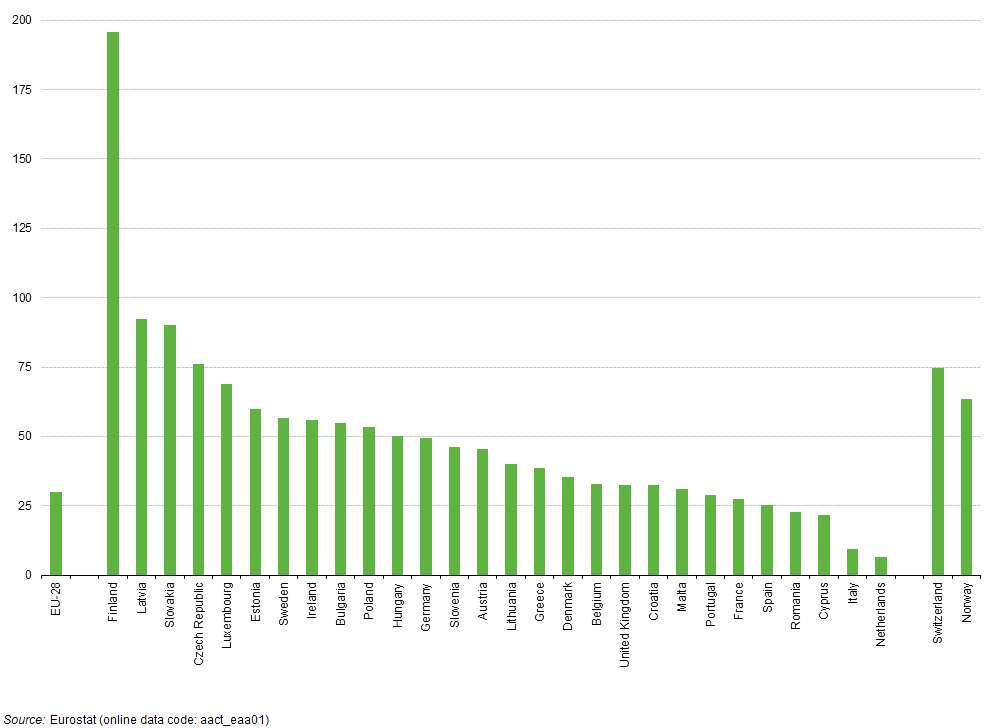 Tästä Eurostatin kaaviosta ilmikäy maataloustukiemme kokoluokka suhteessa maataloustuotannon arvoon. Vertailupintana ovat EU - 20 maat.