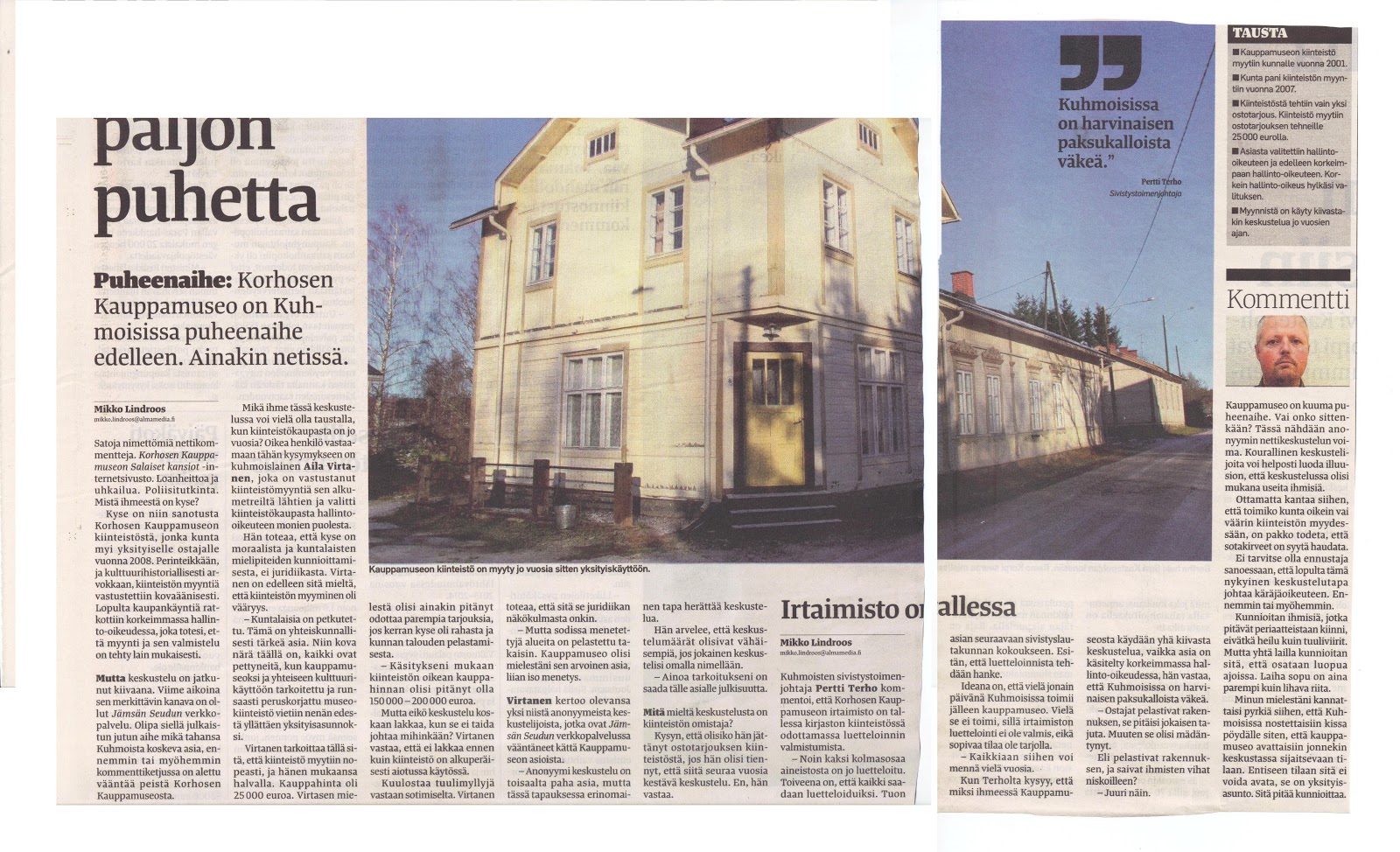 'Tulevissa vaalikeskusteluissa kuhmoislaisille tarjoutuu sadan taalan sauma esittää valtaan pyrkiville Kuhmosten kehittämisen kannalta yksi äärimmäisen tärkeä kysymys, kenellä heistä riittää rohkeutta nostaa pöydälle Korhosen kauppamuseokiinteistön palautusasia.