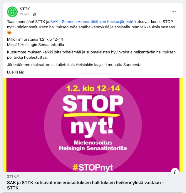 Nyt kun hallitus on tehnyt itsestään työmarkkinaosapuolen (EK:n sätkynukkena), niin lakot eivät ole enää poliittisia