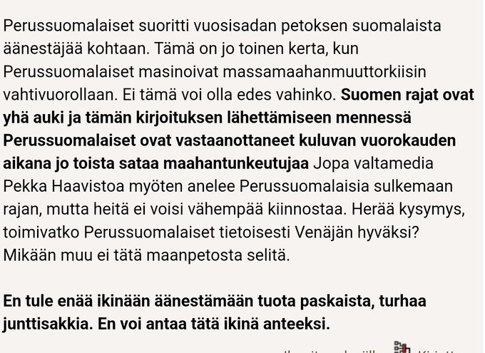 Älähän valehtele.. jos sanna marinin fiaskohallituksen lakiesitys olisi sellaisenaan mennyt läpi niin itärajaa ei olisi voitu sulkea ollenkaan.silloinen oppositio persut ja kokoomus saivat lisättyä pykälän jolla itäraja on mahdollista sulkea. Rajalaki pykälä 16