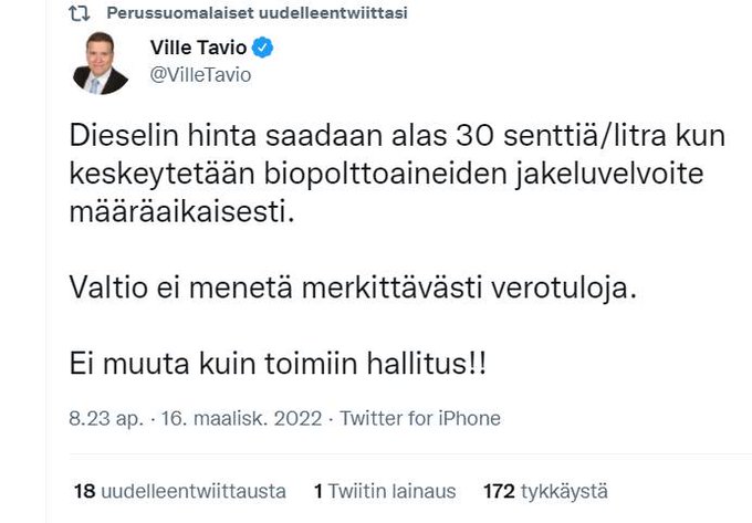 Valehtelette. Bensaveron alennus maksaa valtiolle 170 miljoonaa, vaikutus hintaan 4 c/l, jos sitäkään. Ei nimittäin välttämättä siirry hintaan. Työmatkakulujen omavastuu nousee ja enimmäismäärä alenee. Työhönsä autolla menevä h ä v i ä ä , ei voita. - Anonyymi