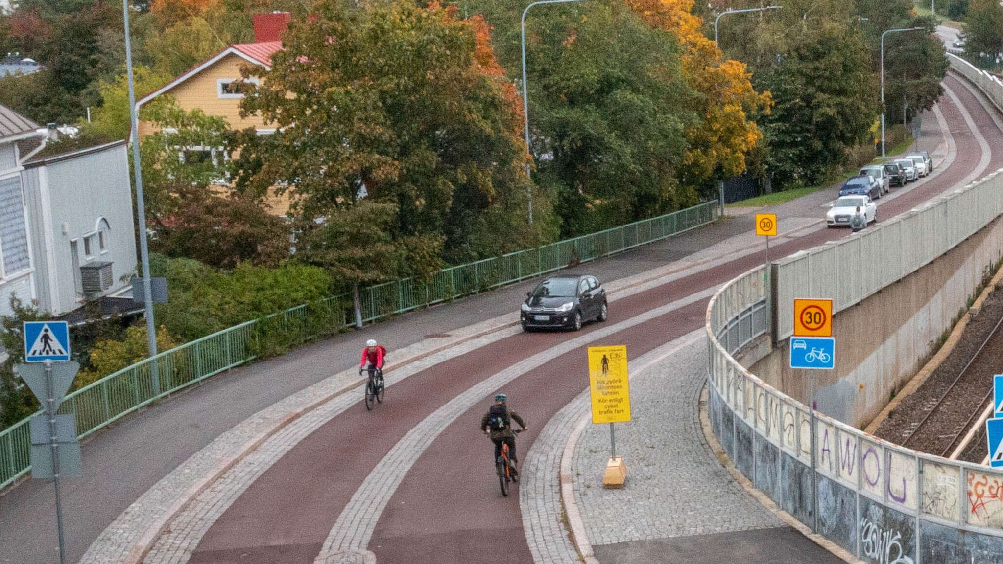 Kannattaisi myös tutustua liikennemerkkeihin. Kuvassa jopa näkyy 30 km nopeusrajoitusmerkin alapuolella PYÖRÄKADUN líikennemerkki.