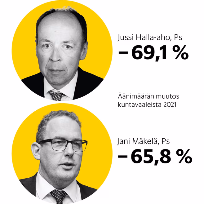 10 eniten ääniä menettänyttä olivat kaikki Perussuomalaisia