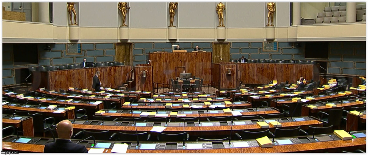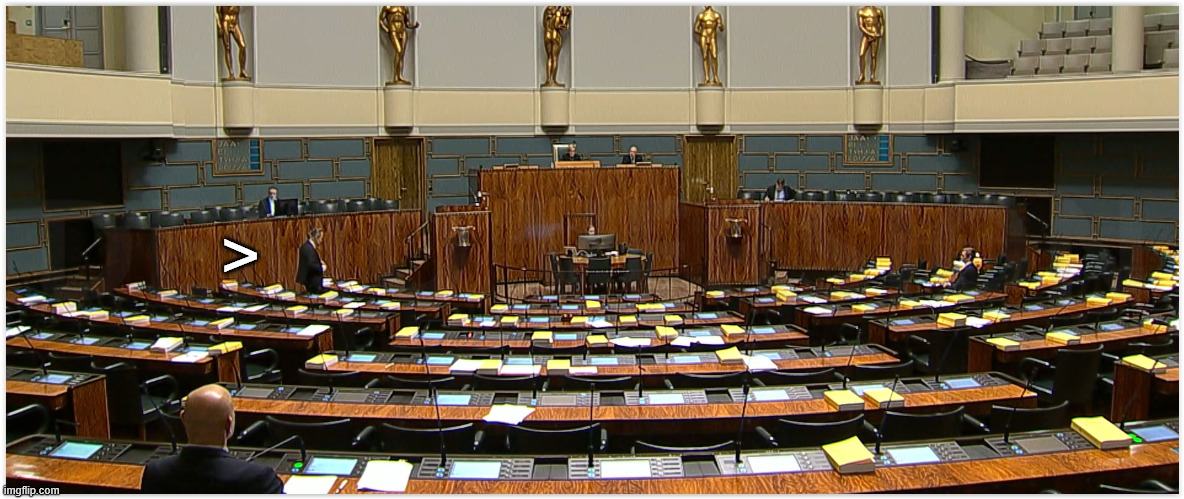 Ilmankos kun ei Eduskunnan live lähetysten aikana näy paikallaan, live lähetyksen loppuessa saapuu elvistelemään tyhjälle joukolle puhumalla, siis tyhjälle Eduskunnalle tyhjää.