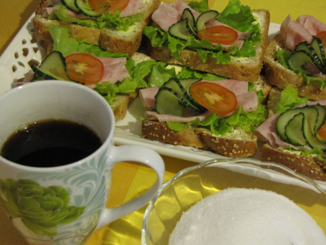 Minulta omenasiivuja, mandariininpaloja, sekä kirsikkatomaatteja tarjottimella, mustaleimaa muutama siivu, maustettua (miedosti) kahvia tai tavallista teetä sokerilla tai ilman, tai englantilaisittain, parasta kivennäisvettä, ruisleipää paahdettuna, voita sulamaan päälle, paahtoleivän tuoksu leviää keittiöön, tunnetko, sekä kahvin tai teen. Sytytän kynttilän pöytään.