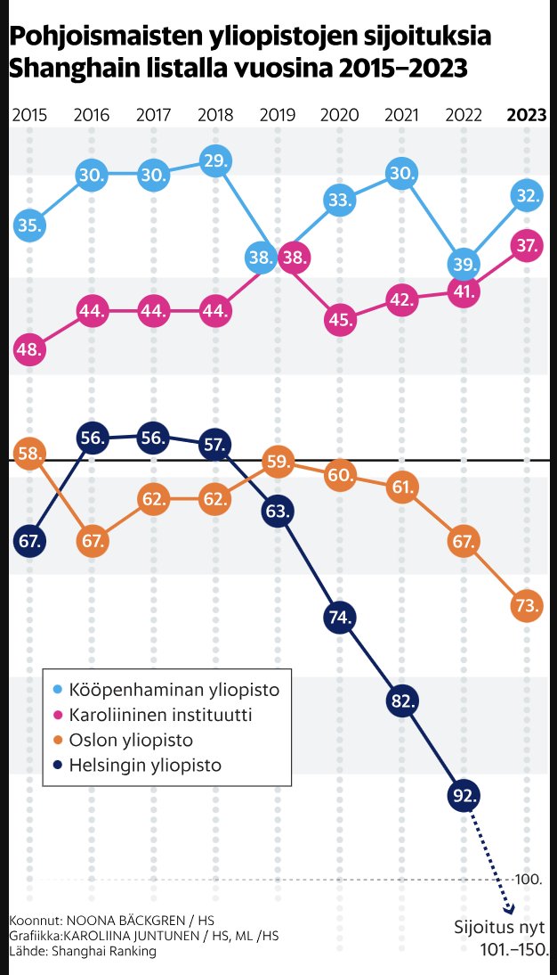 Mustat pallot kuvaavat Helsingin yliopiston sijoitusta kansainvälisesti
