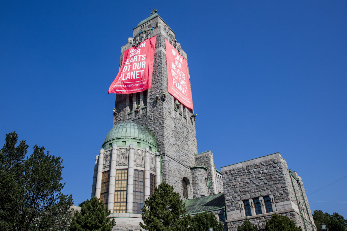 Moni ohikulkija hieroi aamu-unia silmissään nähdessään, mitä Kallion kirkon tornissa tapahtuu. Ympäristöjärjestö Greenpeacen kiipeilijät ripustivat tornin keskustan puoleiselle seinälle valtavan banderollin. Tempaus tehtiin yhteistyössä Kallion seurakunnan kanssa.