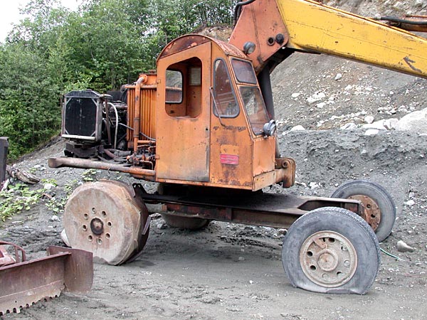Tuohon Bröytiin saattaisi kyllä palatakin syksymmällä. Tuossa kuvassa näkyy Bröytin erikoinen alavaunurakenne: teräksiset etupyörät, jotka voitiin hydraulisesti lukita kaivamisen ajaksi, sekä kevyemmät kumirenkain varustetut takapyörät, joiden varassa matka taittui työmaalta toiselle.